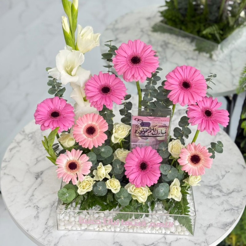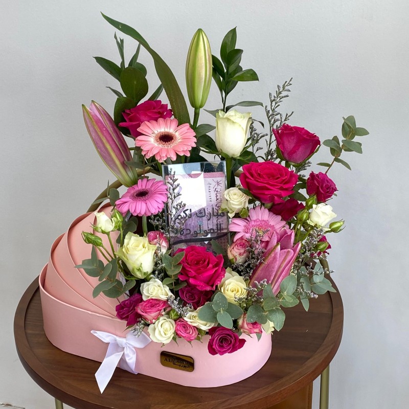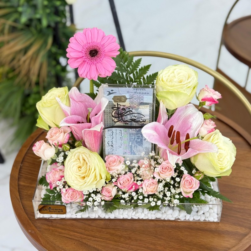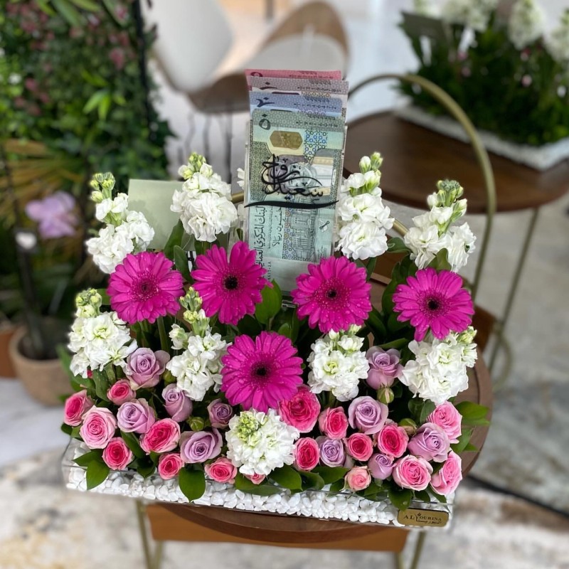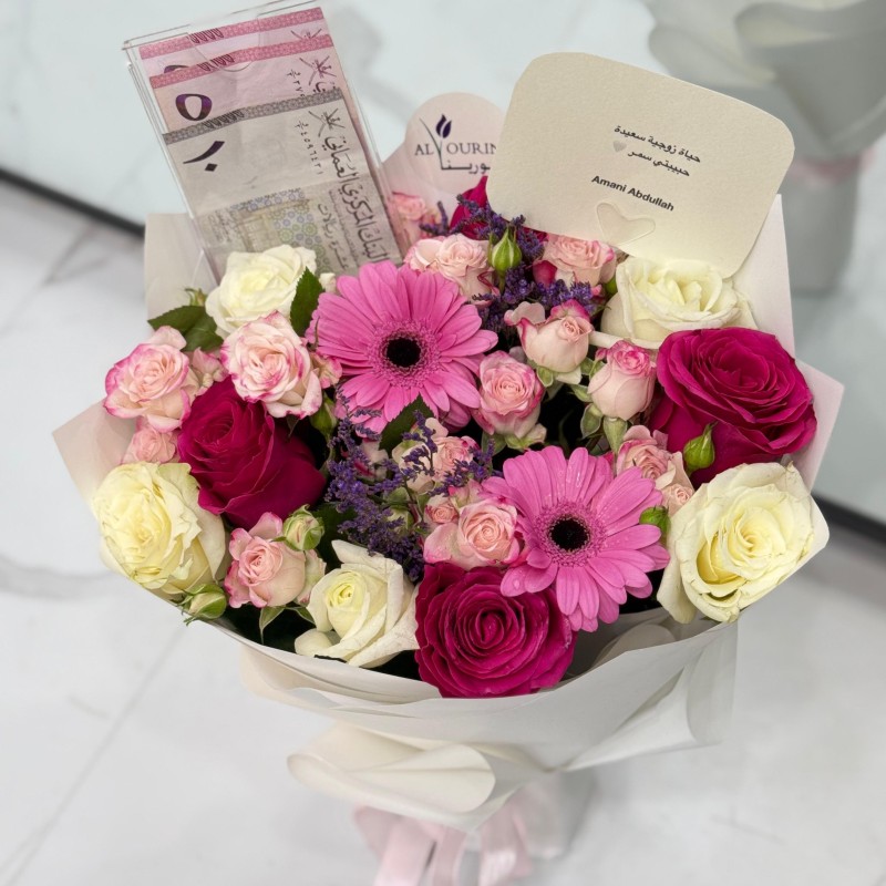ممكن نحط لك مبلغ مالي حسب رغبتك ف الهديةشكل أو حجم الباقة ونوع الورد ممكن يختلف حسب المتوفر. مدة تجهيز الطلب: من ساعة إلى 12 ساعة. تقدر تكتب بطاقة إهداء أو أي ملاحظة في خانة الملاحظات قبل ما تكمل الطلب.