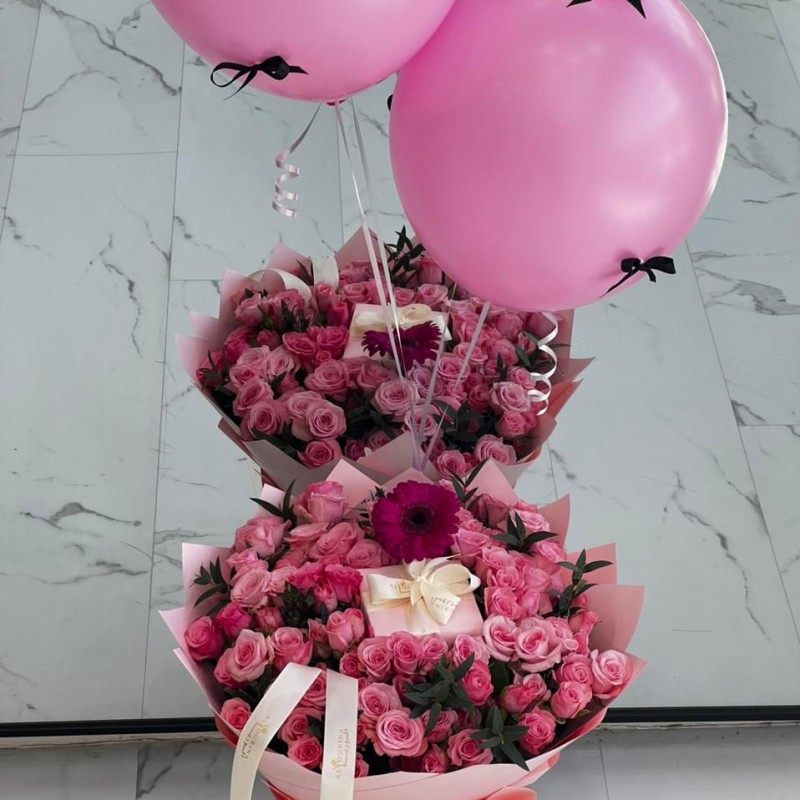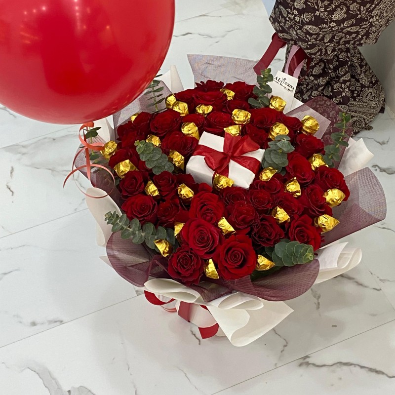 شكل أو حجم الباقة ونوع الورد ممكن يختلف حسب المتوفر.بوكس الشوكلت فيه 21 حبةمدة تجهيز الطلب: من ساعة إلى 12 ساعة.تقدر تكتب بطاقة إهداء أو أي ملاحظة في خانة الملاحظات قبل ما تكمل الطلب.