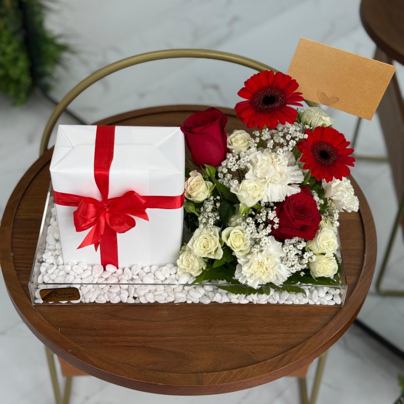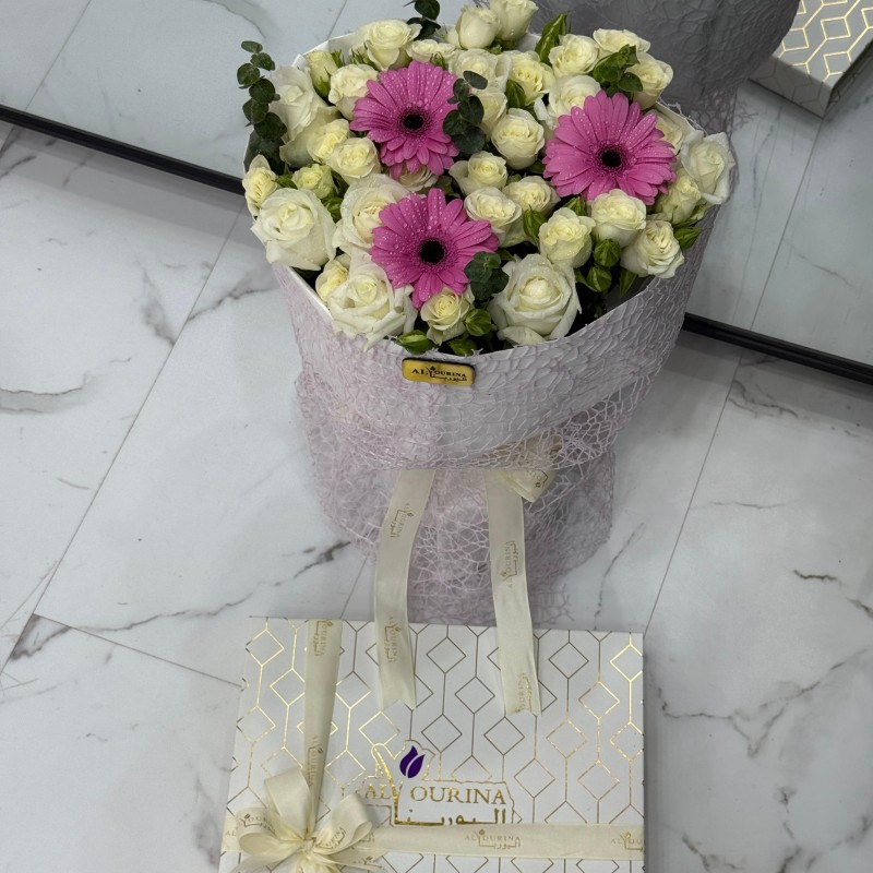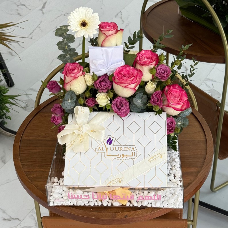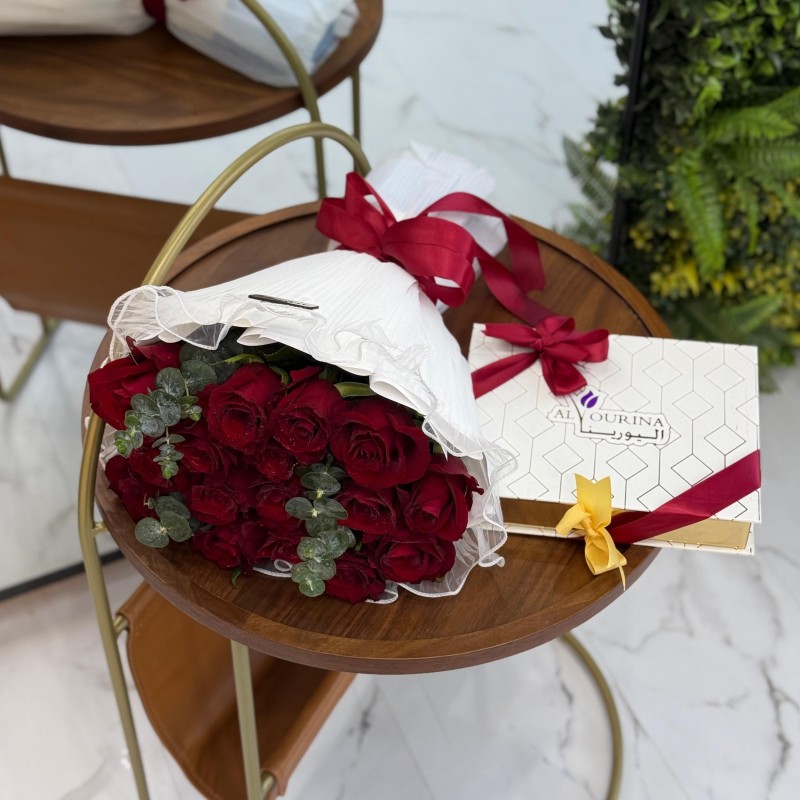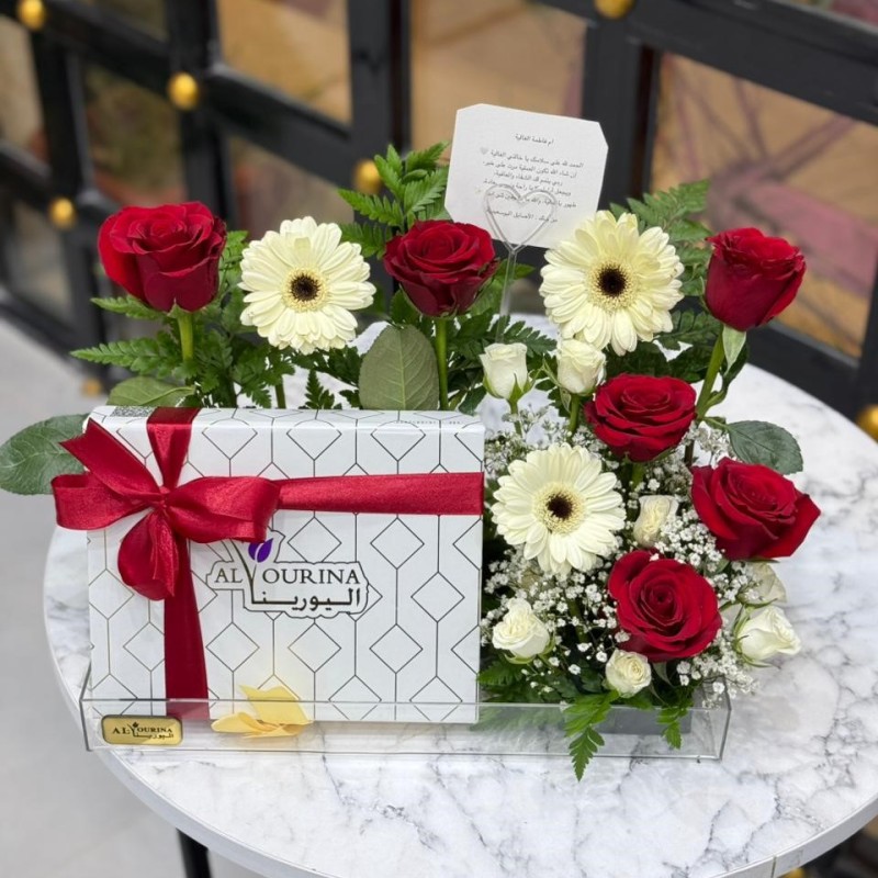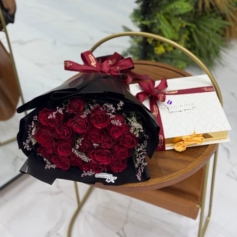 الباقة النهائية قد تختلف في الحجم أو الشكل أو نوع الورد المستخدمبوكس الشوكلت فيه (21 حبة)(مدة تجهيز الطلب: ساعة - 12 ساعة )بإمكانك كتابة بطاقة إهداء أو ملاحظات في خانة الملاحظات (قبل إتمام عملية الدفع)