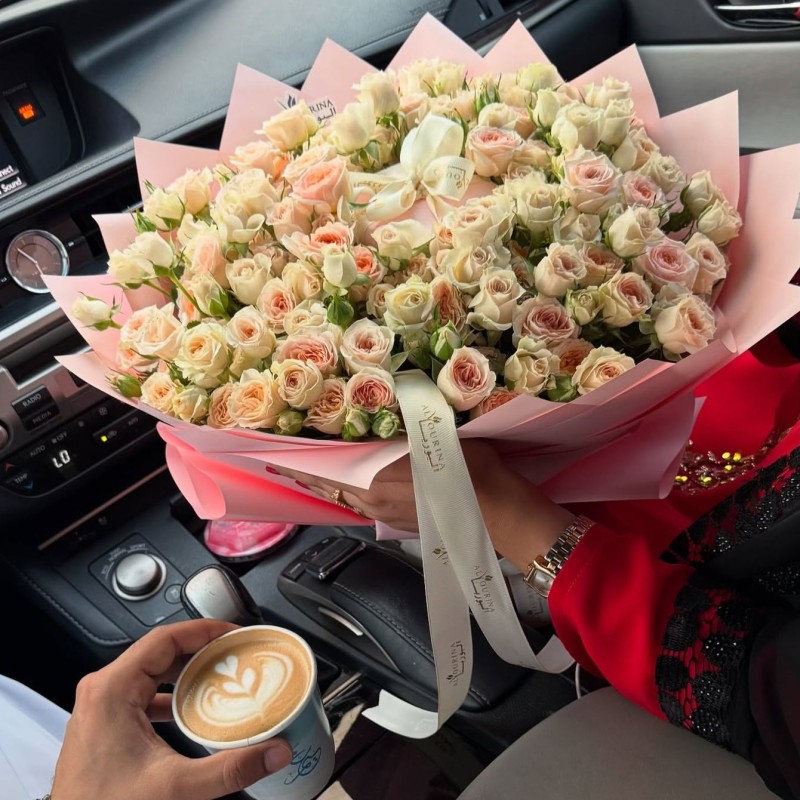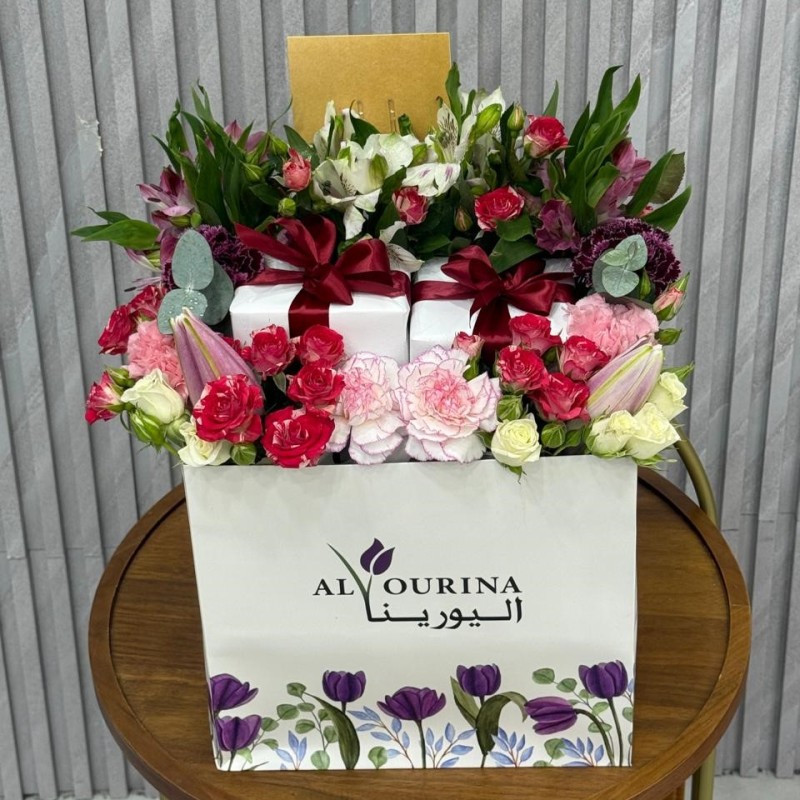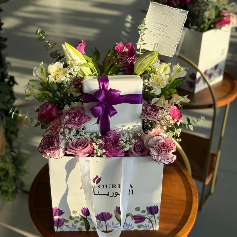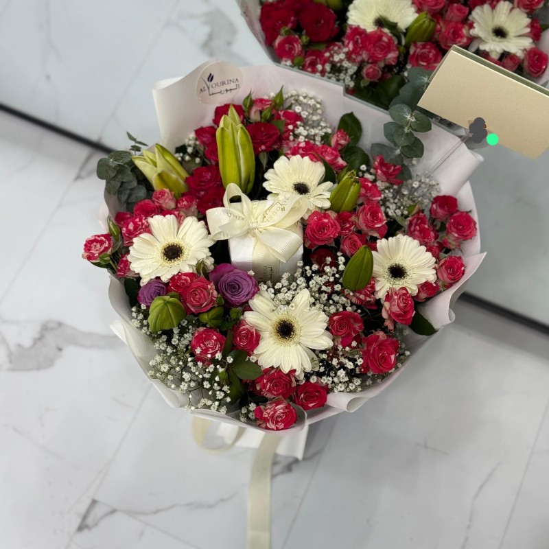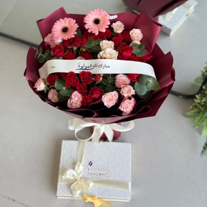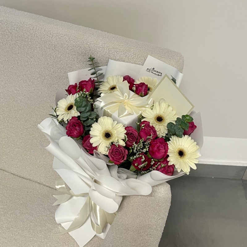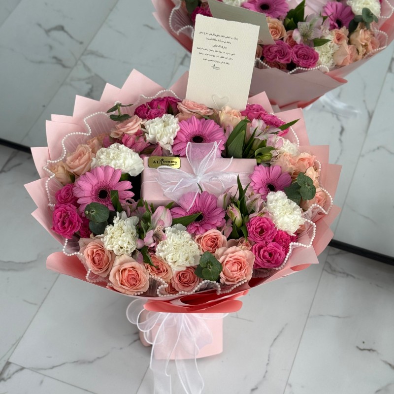 شكل أو حجم الباقة ونوع الورد ممكن يختلف حسب المتوفر. مدة تجهيز الطلب: من ساعة إلى 12 ساعة. تقدر تكتب بطاقة إهداء أو أي ملاحظة في خانة الملاحظات قبل ما تكمل الطلب.