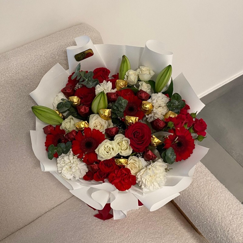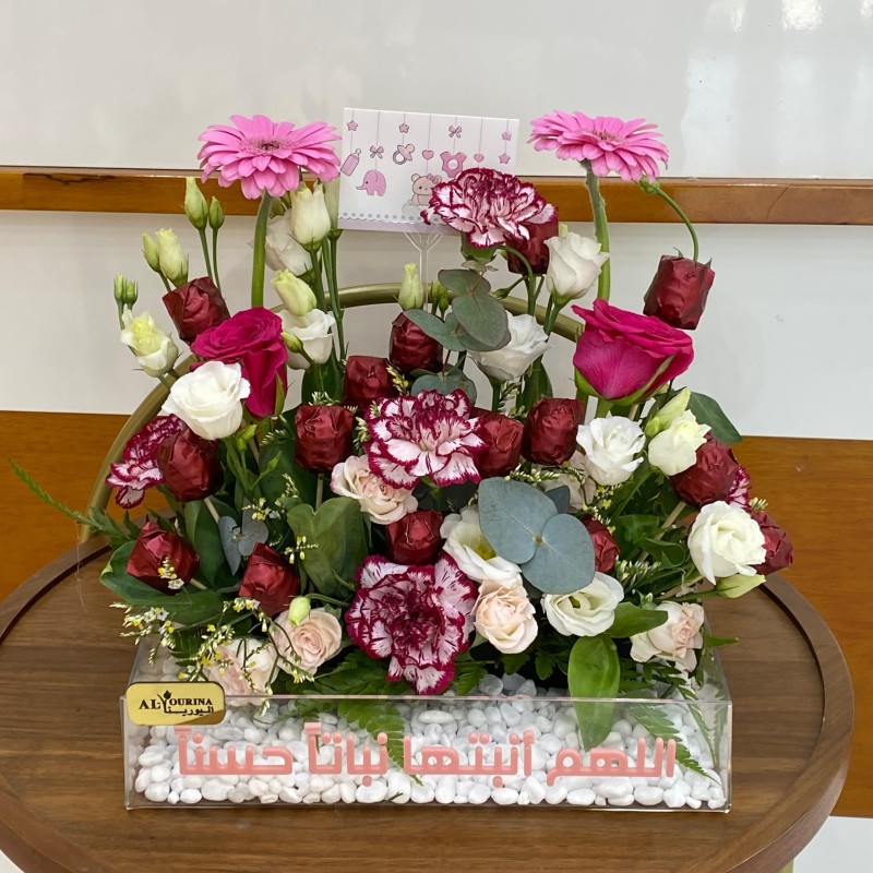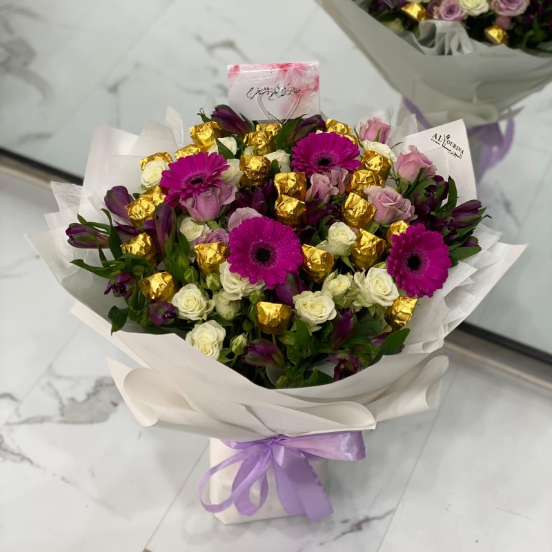 الباقة النهائية قد تختلف في الحجم أو الشكل أو نوع الورد المستخدم على حسب رغبتكالباقة فيها حبات شوكلت(مدة تجهيز الطلب: ساعة - 12 ساعة )بإمكانك كتابة بطاقة إهداء أو ملاحظات في خانة الملاحظات (قبل إتمام عملية الدفع)