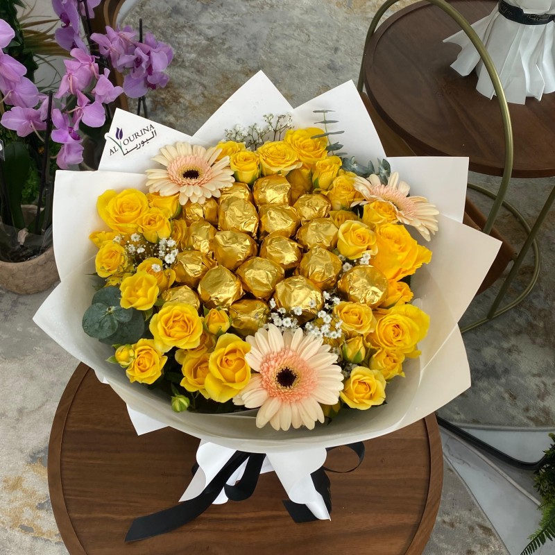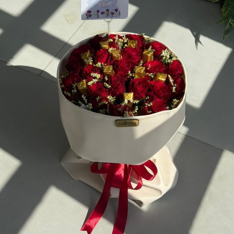 الباقة النهائية قد تختلف في الحجم أو الشكل أو نوع الورد المستخدمفيها حبات شوكلت(مدة تجهيز الطلب: ساعة - 12 ساعة )بإمكانك كتابة بطاقة إهداء أو ملاحظات في خانة الملاحظات (قبل إتمام عملية الدفع)